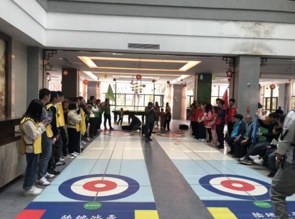 最后一個項目“旱地冰壺”,以小組為單位,在平滑的地面上進(jìn)行投擲的競賽項目。通過讓自己的壺停放在預(yù)設(shè)好的位置,或?qū)Ψ角驌舫?,達(dá)到制勝的目的。這項競賽集智慧、戰(zhàn)術(shù)、判斷、技巧、把握時機(jī)的能力為一體,充分發(fā)揚(yáng)了雙方隊員誠實信任的體育精神。