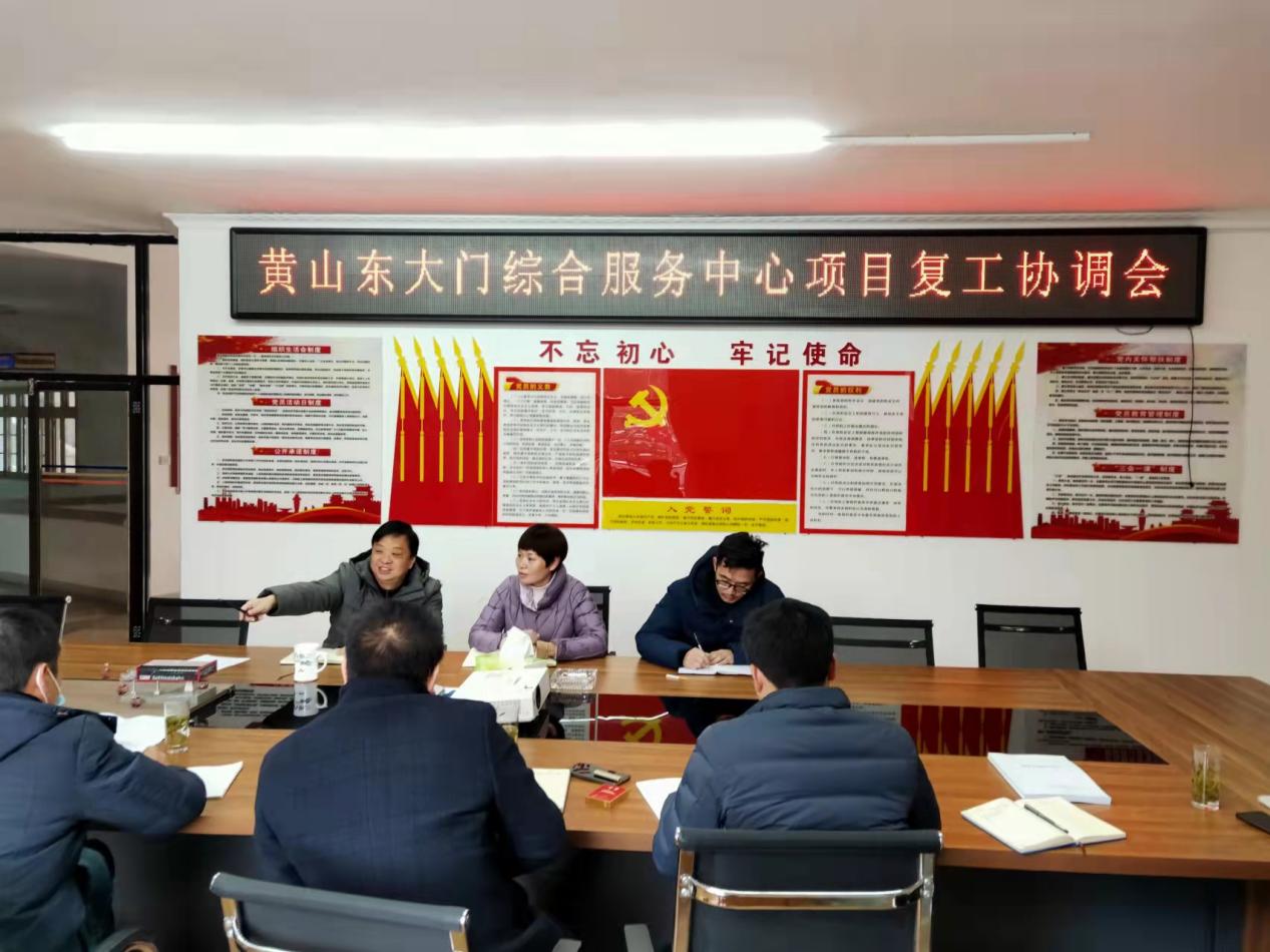 上午9時,黃山東大門綜合服務中心項目業(yè)主柯伯行主任主持召開了項目年后復工協(xié)調(diào)會,邀請譚家橋鎮(zhèn)有關(guān)領(lǐng)導協(xié)調(diào)推進項目順利進行,會議就渣土堆放、蓄水池遷建、臨時用電和臨時設施審批等問題進行深入的討論,并給出初步的解決方案。